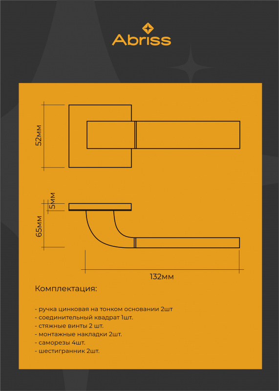 Комплект: две ручки на одно дверное полотно, монтажный комплект, соединительный квадрат (8 мм*8 мм*110 мм).