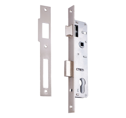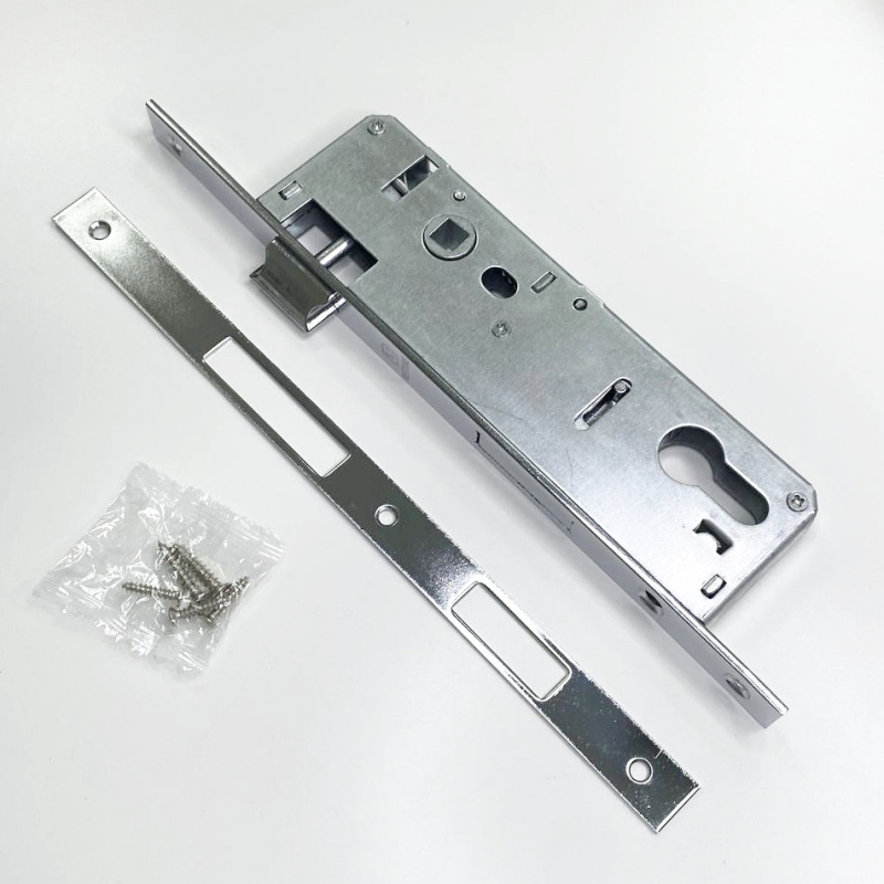 Отличительным признаком данной серии замком является межосевое расстояние 92 мм, которое ялвяется одним из стандартных в ПВХ дверях. Ответные планки входят в комплект. Декоративные накладки на цилиндровый механизм в комплект не входят.