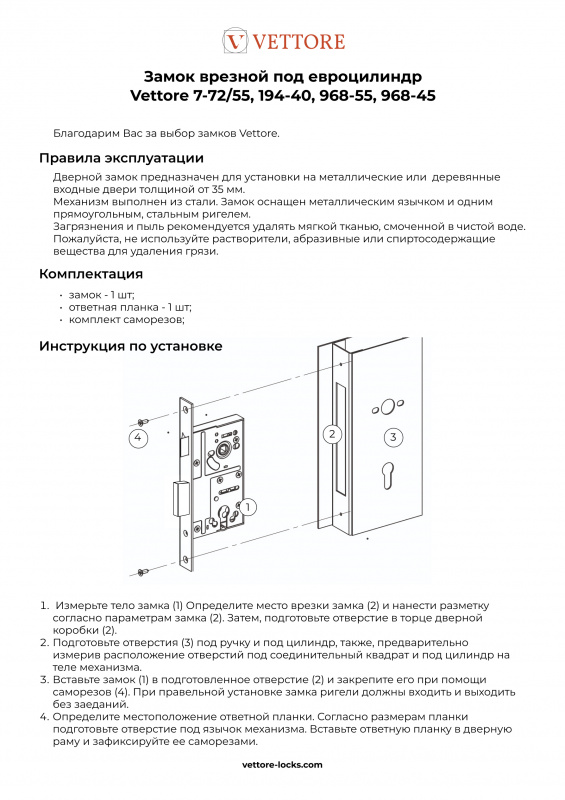 Универсальный цилиндровый замок с защелкой VETTORE для пластиковых (ПВХ) дверей выпускается с бэксетами 20, 25, 30 и 35 мм.