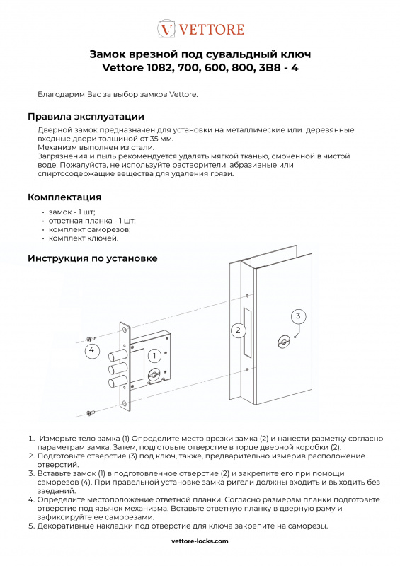 Врезной замок VETTORE ЗВ 8-4 CP (Хром, 3 ключа) для деревянных и металлических дверей.