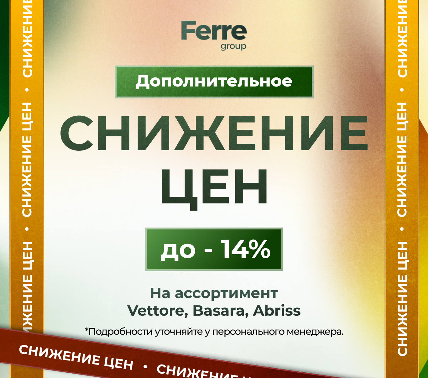В связи с укреплением курса рубля, мы дополнительно СНИЖАЕМ цены до -14% на ассортимент TM VETTORE, TM ABRISS и TM BASARA, а также стартует "Весенняя акция" с 28.04 по 11.05 дополнительные скидки на позиции TM VETTORE и TM ABRISS!