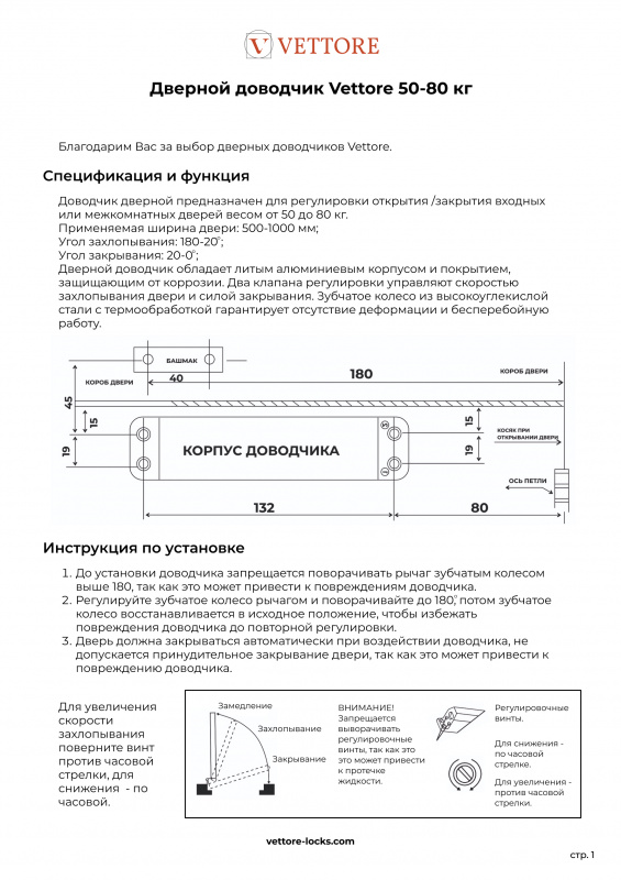 Обращаем Ваше внимание! Для продления срока эксплуатации доводчика, просим устанавливать товар в соответствии с инструкцией, подбирать весовую категорию верно, не фиксировать дверь в открытом положении более чем на 120 градусов, осуществлять регулировку винтов доводчика в летний и зимний период.