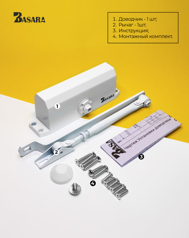 В комплект товара входит: дверной доводчик, монтажный комплект, декоративная накладка, инструкция по установке.