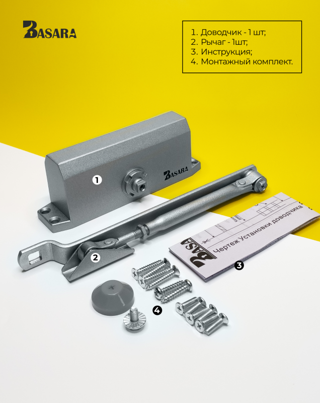 В комплект товара входит: дверной доводчик, монтажный комплект, декоративная накладка, инструкция по установке.