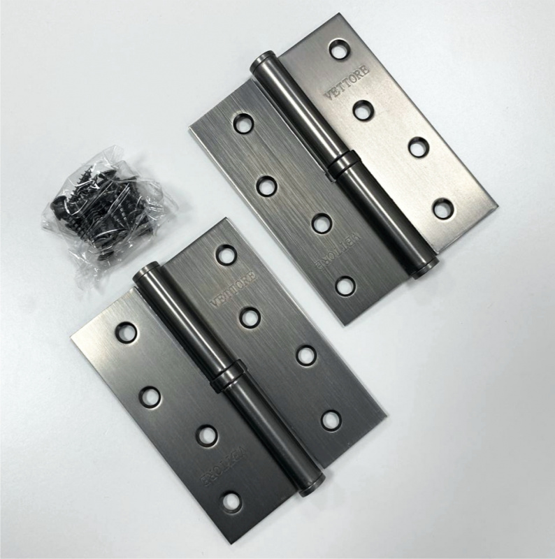 Комплект дверных петель карточных универсальных с врезкой VETTORE 100×75×2.5mm – 4BB GR (Графит) выполнен из нержавеющей стали и подойдет для установки на дверное полотно весом до 30-40 кг.