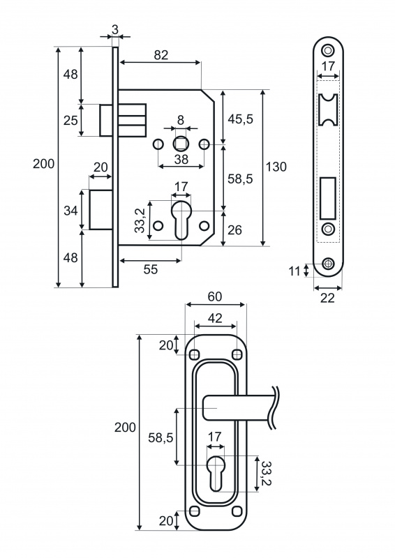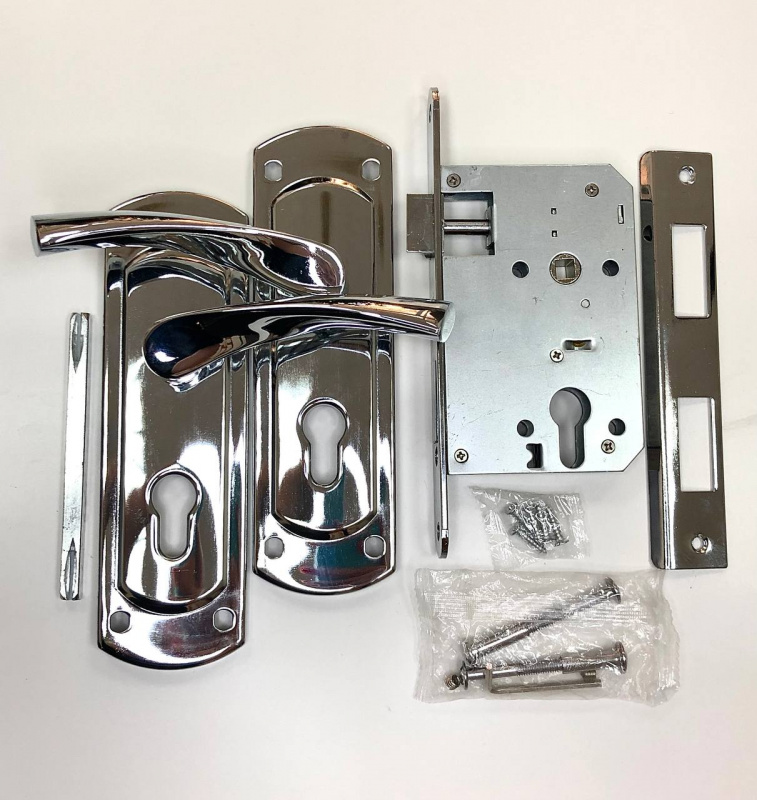 Комплектация: замок врезной под цилиндр, ручка на планке, монтажный комплект.