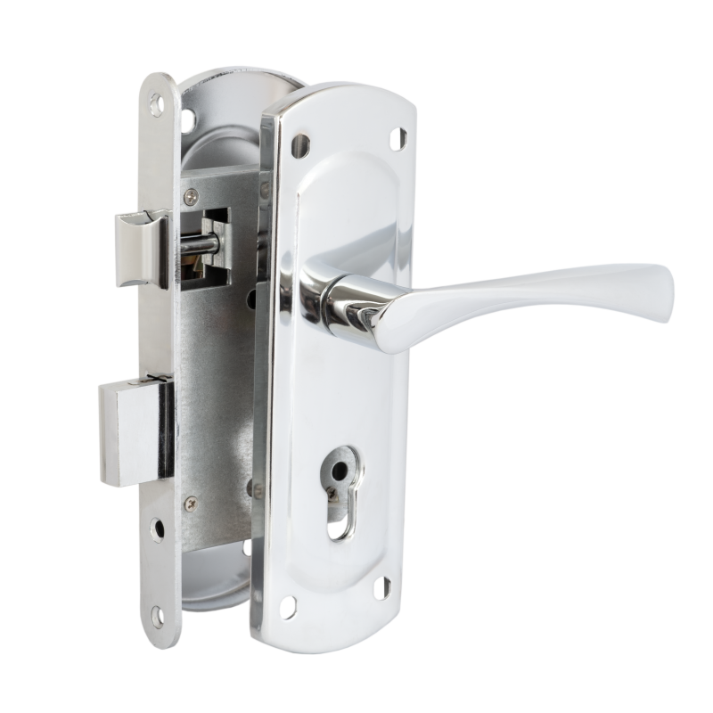 Комплект для входных дверей: замок врезной VЕTTORE 1423 CP в комплекте с ручкой на планке для входных дверей дополнит интерьер жилого и офисного помещения.