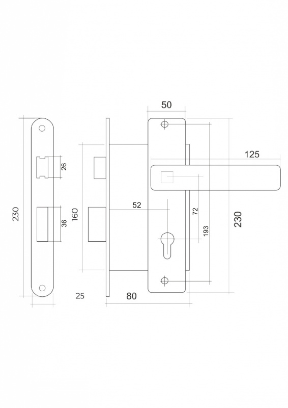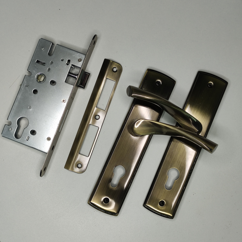 Комплектация: замок врезной под цилиндр, ручка на планке, монтажный комплект.