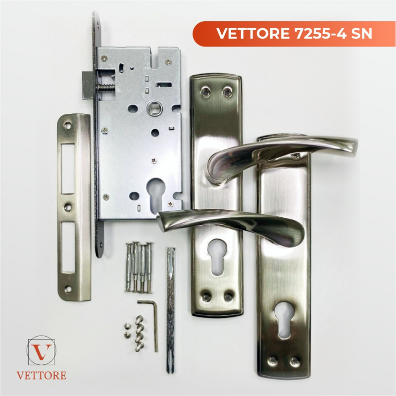 Комплект для входных дверей: замок врезной VЕTTORE 7255-4 SN в комплекте с ручкой на планке для входных дверей дополнит интерьер жилого и офисного помещения.