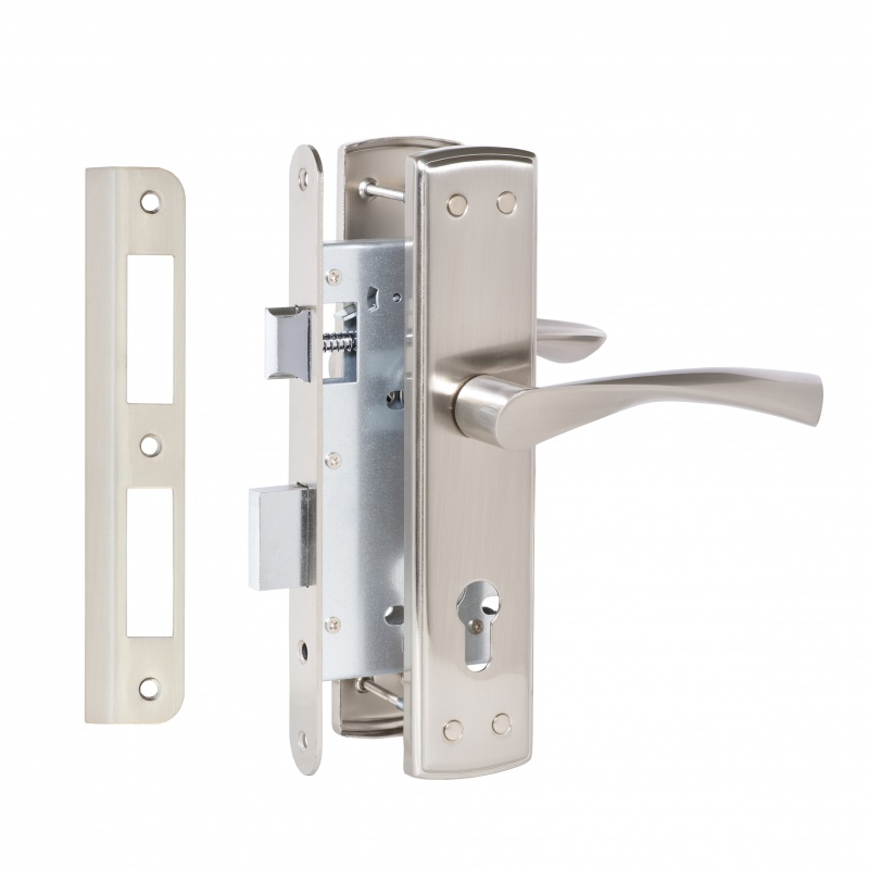 Комплектация: замок врезной под цилиндр, ручка на планке, монтажный комплект.