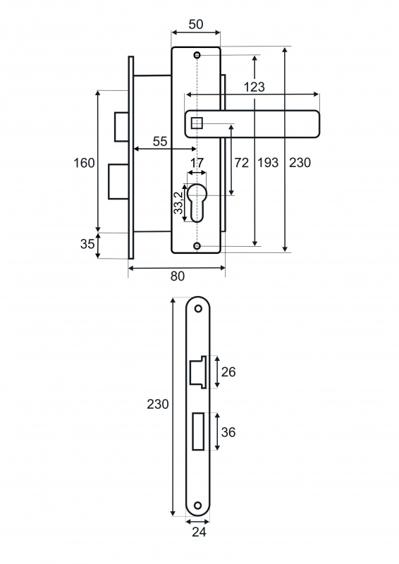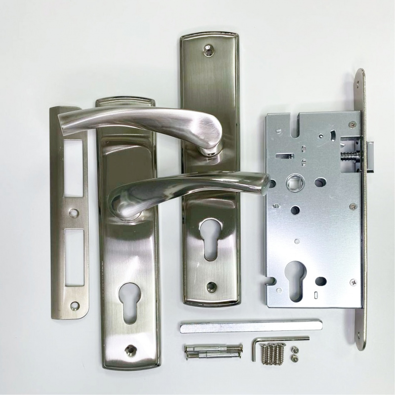 Комплект состоит из врезного замка и ручки на планке.