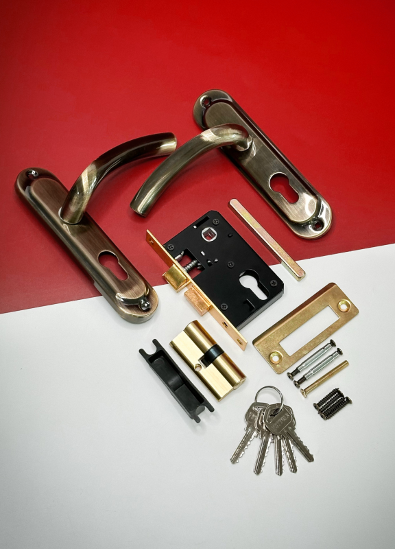 Комплект: один замок, монтажный комплект, ответная планка, замок, цилиндр.