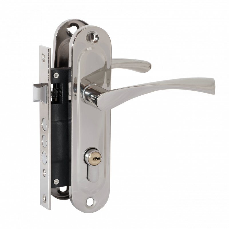 Комплектация: замок врезной под цилиндр, ручка на планке, монтажный комплект, цилиндровый механизм.