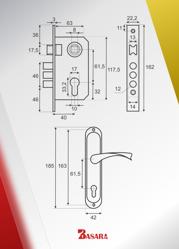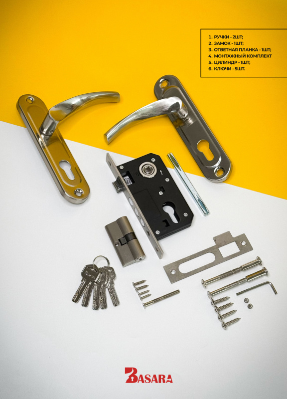 Комплект для входных дверей: замок врезной BASARA 1023 NI в комплекте с ручкой на планке для входных дверей и цилиндровым механизмом дополнит интерьер жилого и офисного помещения.