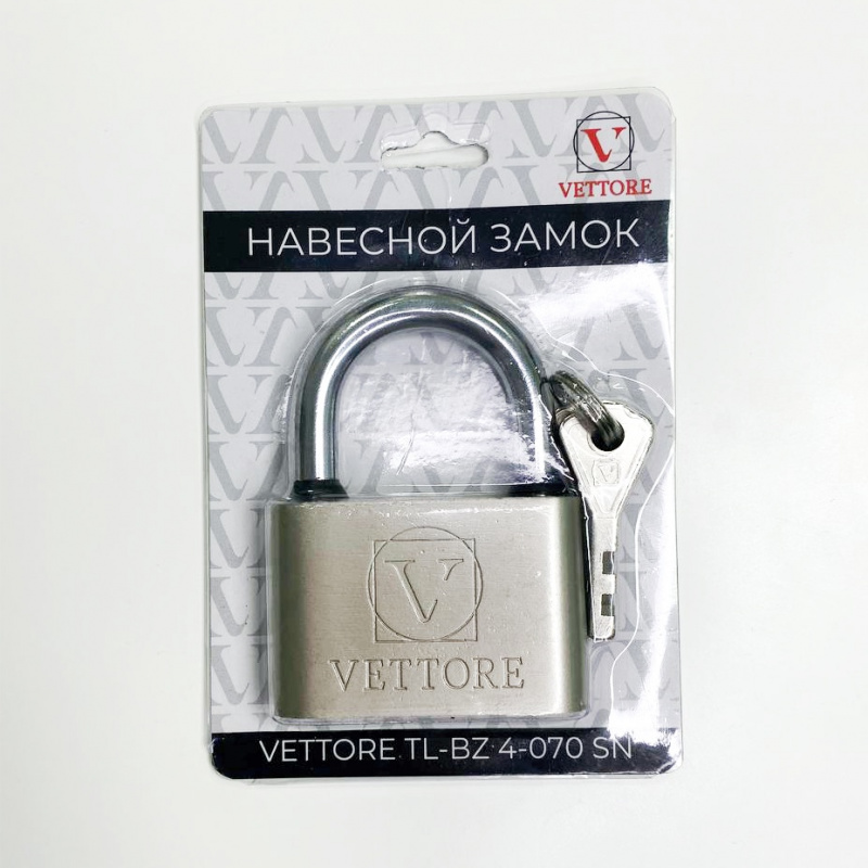 Замок навесной VETTORE TL-BZ 4-070 (сталь, закругленной формы, 4 ключа) SN (Сатин) – универсальный замок для использования в хозяйственных и подсобных помещения, подвалах, дачных постройках, распределительных щитках, почтовых ящиках, металлических шкафах.