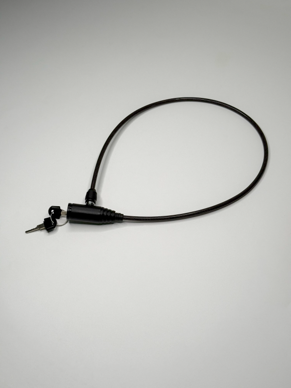 Трос из закаленной стали, заключенный в пластиковый кожух, оснащен запирающим механизмом с ключом. Пластиковый кожух обеспечивает дополнительную защиту от взлома и защищает замок от воздействия окружающей среды.
